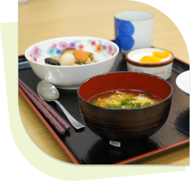 施設内で調理した温かい食事を毎食提供します。一人ひとりの嚥下の状態に合わせた食事形態、季節感のある献立、誕生日やお正月などの行事食。「食べること」を、最期まで楽しんでいただけるよう工夫し続けています。