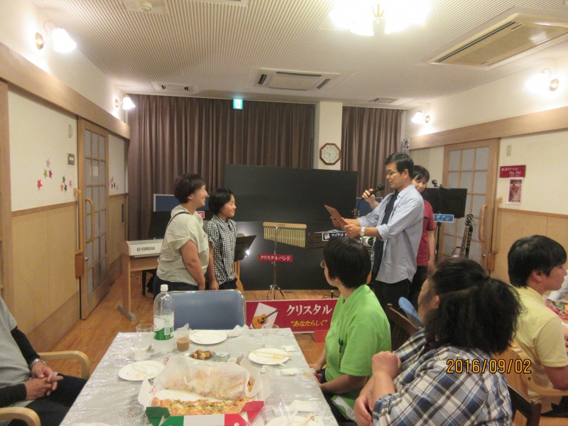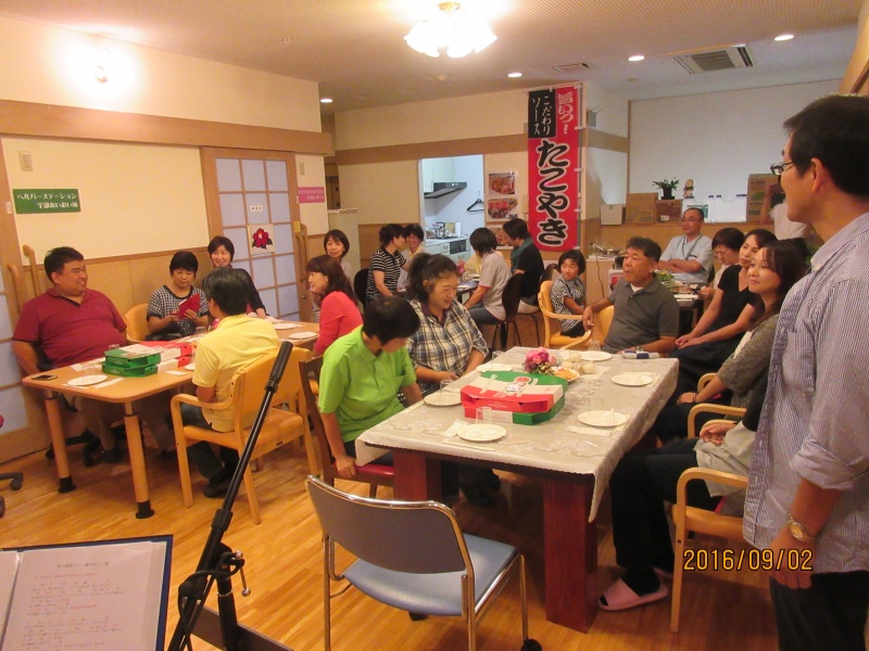 とろけるチーズがたっぷりのった熱々のピザ、職員手作りのおにぎり、施設長が腕を振るっての特製たこ焼きを頬張り、皆さんご満悦。