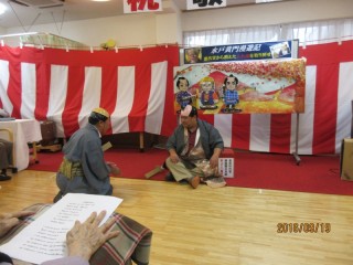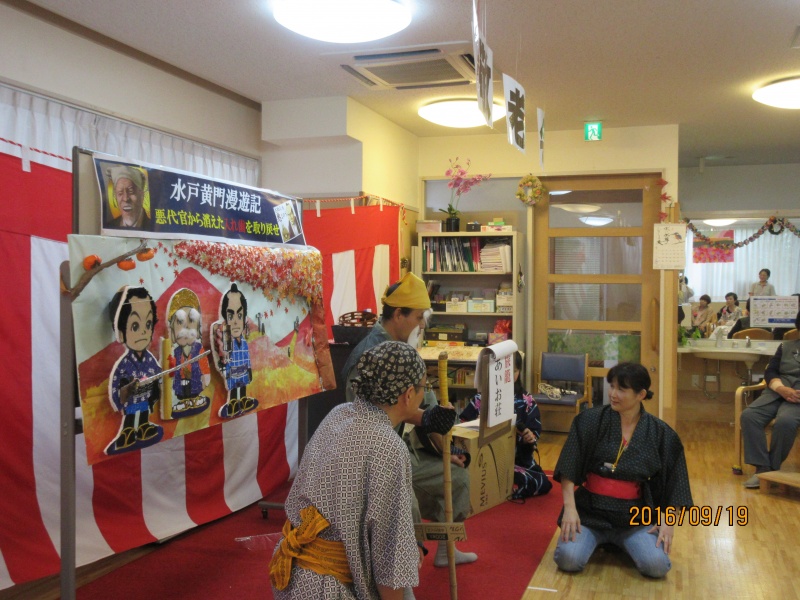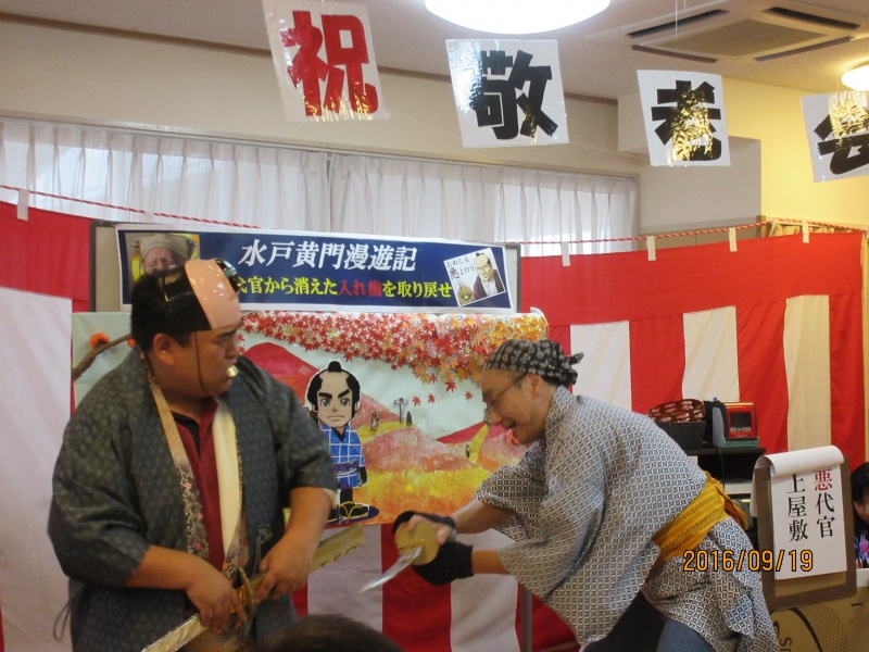 第二部は、本日のメーンイベント、劇団「すかし座」による「水戸黄門漫遊記」。本日のお題は「痛快!!悪代官から消えた入れ歯を取り戻せ」。約1か月前から猛特訓した成果あって、職員扮する御老公一行は、見事、恩田村にはびこる悪代官を退治し、無事、備前の国に旅立たれました。