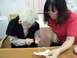 毛糸を編んで「三角スカーフ」を作っており、そんな心優しい職員の周りには、自然にご利用者さんが、いつも集まってきます。
