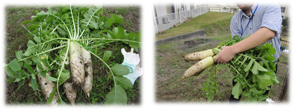 畑には、サツマイモだけではなく、こんな立派な大根も育っており、大きく育っている