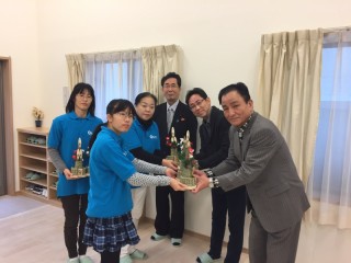 門松には、防府市の観光マスコット「ぶっちー」の焼き印が入っており、ものづくり塾の方は「おじいさんや子どもたちと制作したものです。良いお正月をお迎えください。」との言葉に対し、大矢本部長より「大変嬉しい贈り物です。各ユニットに飾らせていただき、ヒノキの香りとともに良いお正月が迎えられそうです。」と感謝の言葉を述べられました。