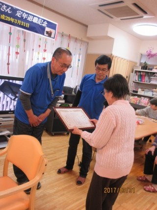 年度末の3月31日。ボブもあと数時間でひとつの会を定年。継続雇用の道を選択していただいたとは言え、本当にこれまでお疲れ様でした。利用者様、職員からはこれまでのボブのひたむきな姿勢を讃え、綺麗な花束が贈られました。ありがとう・・・。