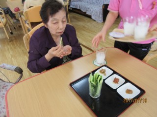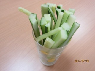 キュウリはステックにして、もろみ味噌をつけて「いただきま~す」。