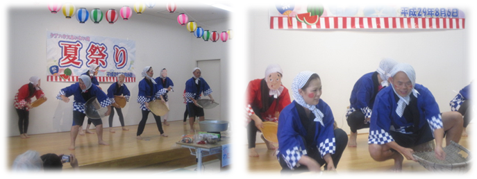 どじょうを捕まえている様子を表現しようと職員も一生懸命で、参加されていたご利用者や