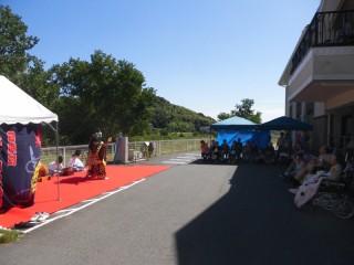 演舞がはじまると、職員も利用者さんも、囃子の太鼓のリズムに、心も身体も揺れ動き、豪華絢爛で雅な石見神楽の舞台に魅了されていました。一階の舞台前はもちろんの事、二階のお部屋から観ておられる利用者の方々もたくさんいらっしゃいました。中には涙を流して拝みながら観ておられる利用者さんや、職員に「お父さんにも見せてあげたいから…」と遺影を抱いて観ておられる方もいらっしゃいました。心の中に熱いものと、心躍る雅で勇敢な石見神楽の神話の世界から解き放たれ、大歓声の中…終演…。
