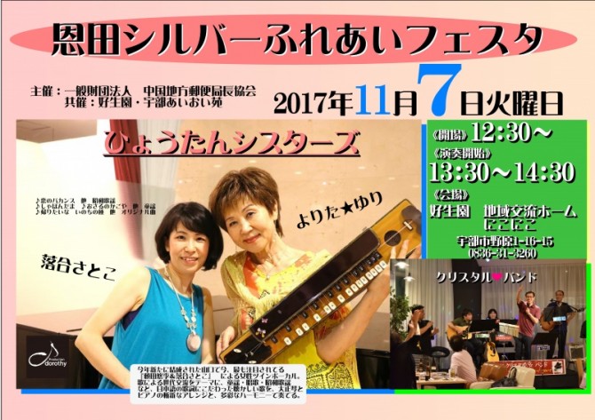 来る11月7日、文化の日スペシャルとして、一般財団法人 中国地方郵便局長協会主催(好生園・宇部あいおい苑共催)による「恩田シルバーふれあいフェスタ」が開催されます。音楽を通じて恩田地区の地域交流を図るものです。