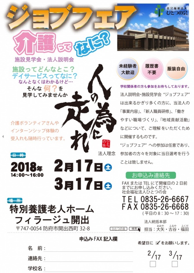 2月17日(土)法人説明会・施設見学会“ジョブフェア”開催【統括本部】 - 社会福祉法人ひとつの会