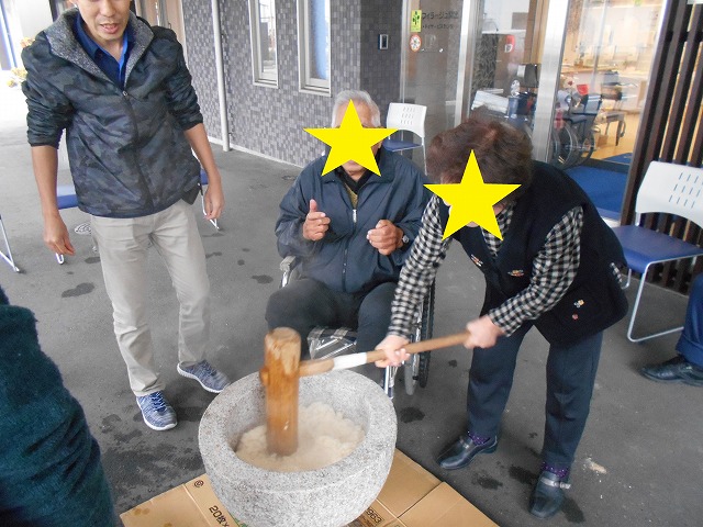 男性だけでなく女性の利用者様も、つく側に回り力を合わせてもちをつきます!!