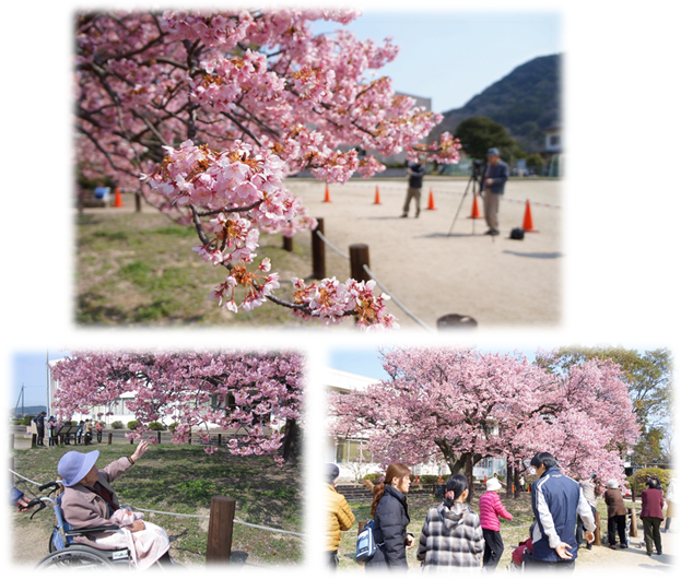 3月中旬…ユニットの外出で、向島小学校の蓬莱桜をご利用者の皆さんと一緒に