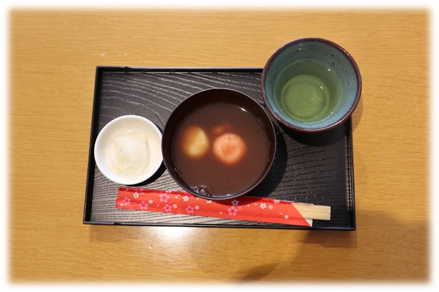 ぜんざいには、紅白の白玉団子を入れ、食べていただきました。