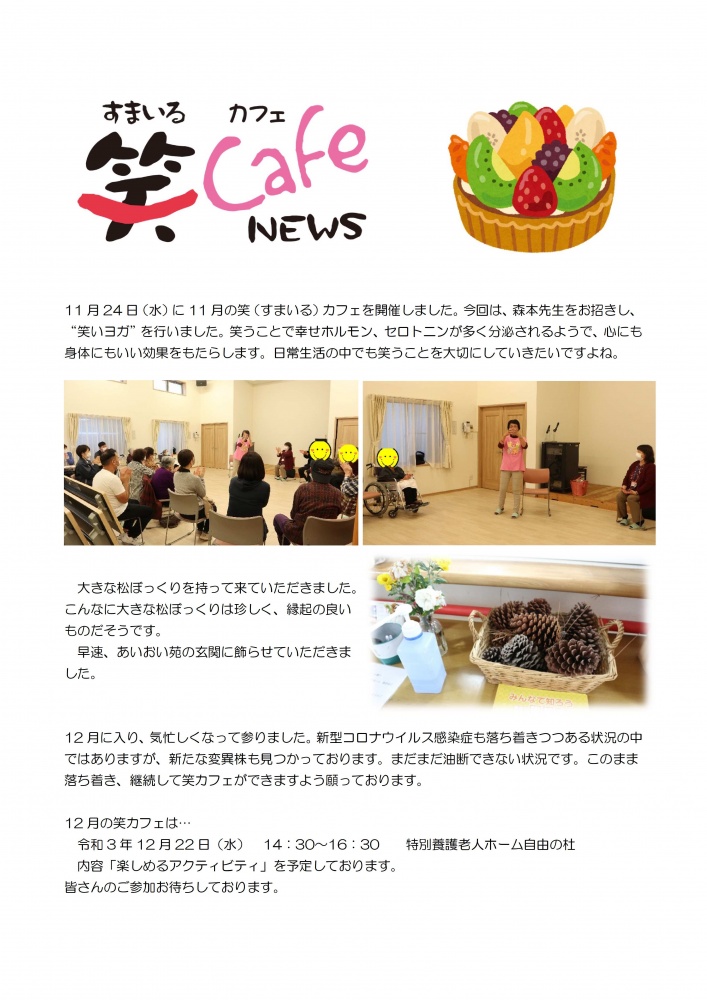笑(すまいる)カフェNEWS ☆11月は”笑いヨガ”を開催!! 2021.12.14 おしらせ, 日誌 前後の記事 最新記事へ 村岡知事に感謝 古い記事へ 笑(すまいる)カフェNEWS ☆10月は”コリス体操”を開催!!