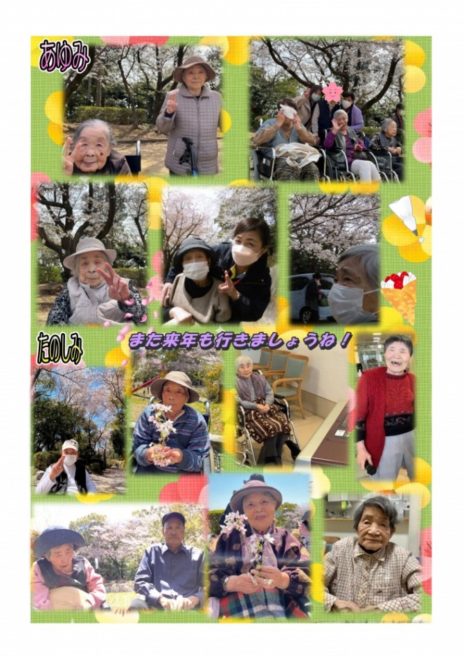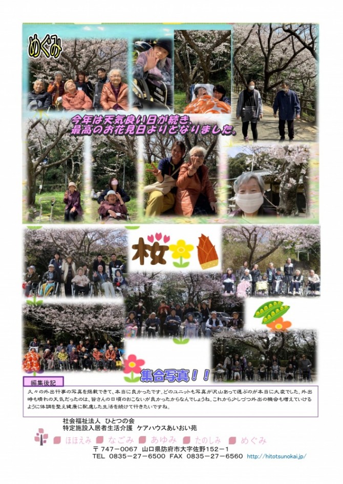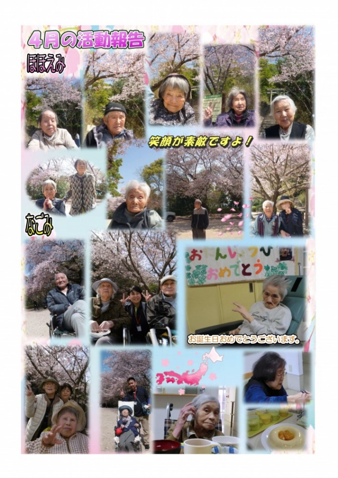 3月末から4月初旬にかけて桑の山公園にお花見外出をおこないました。幸い外出日は全て天候に恵まれて、桜の花と一緒に春の暖かさを感じることが出来ました。ご入居者様の表情も自然に緩み笑顔溢れる写真が沢山載った「ななお5月号」です。