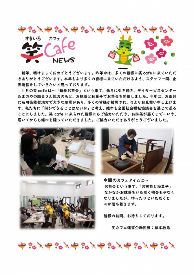 【認知症カフェ】笑(すまいる)cafeニュース1月開催 2024.02.14 日誌 前後の記事 最新記事へ オ・サーバ刊号2月号をアップロードしました!【オ・サーバaioi】 古い記事へ 能登半島震災被災地訪問