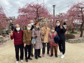 デイサービスでは歩行訓練を兼ねて防府天満宮の梅の花を見物に行きました