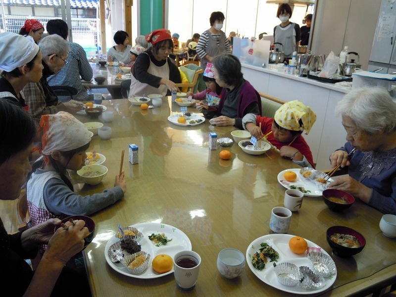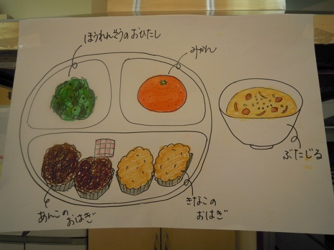 メニュー あんこのおはぎ ・ きなこのおはぎ ・ ほうれんそうのおひたし ・ ぶたじる ・ みかん