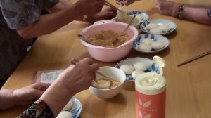 食べ終わった後は、スタッフ演奏の三味線で「月」に関連した童謡を一緒に歌い、これも「懐かしいね~」と喜ばれていました。