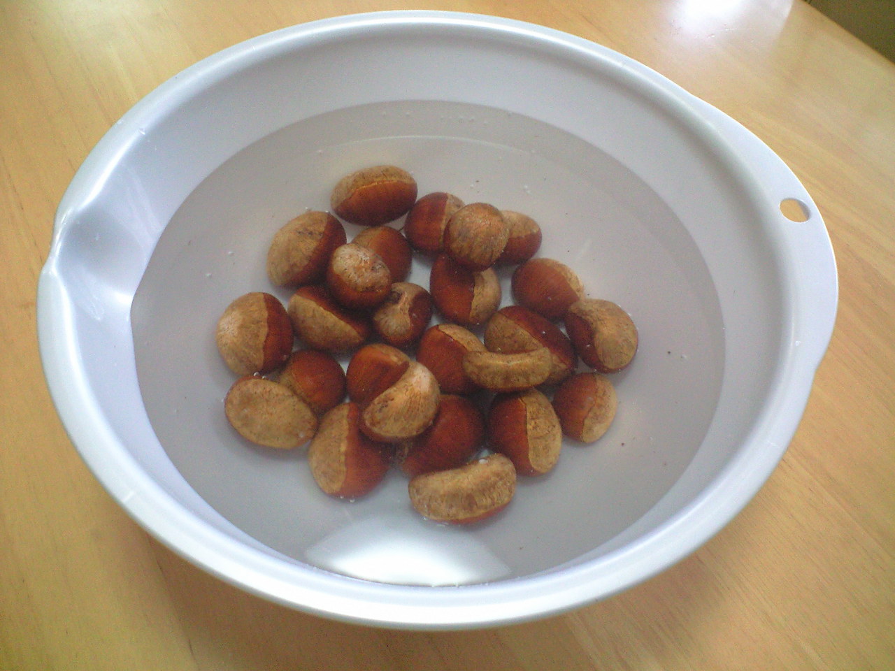 「よく剥けるよ」 とのことで、塩水に10分以上つけました。 拾いたてで、虫食いの栗も混じっていた様子。途中、虫の幼虫が浮いてくるという光景も・・・。 「そうそう、虫が浮いてくるいねぇ」 と、皆さんにとっては見慣れた光景のようでした。 (私は多少ビックリ・・・)