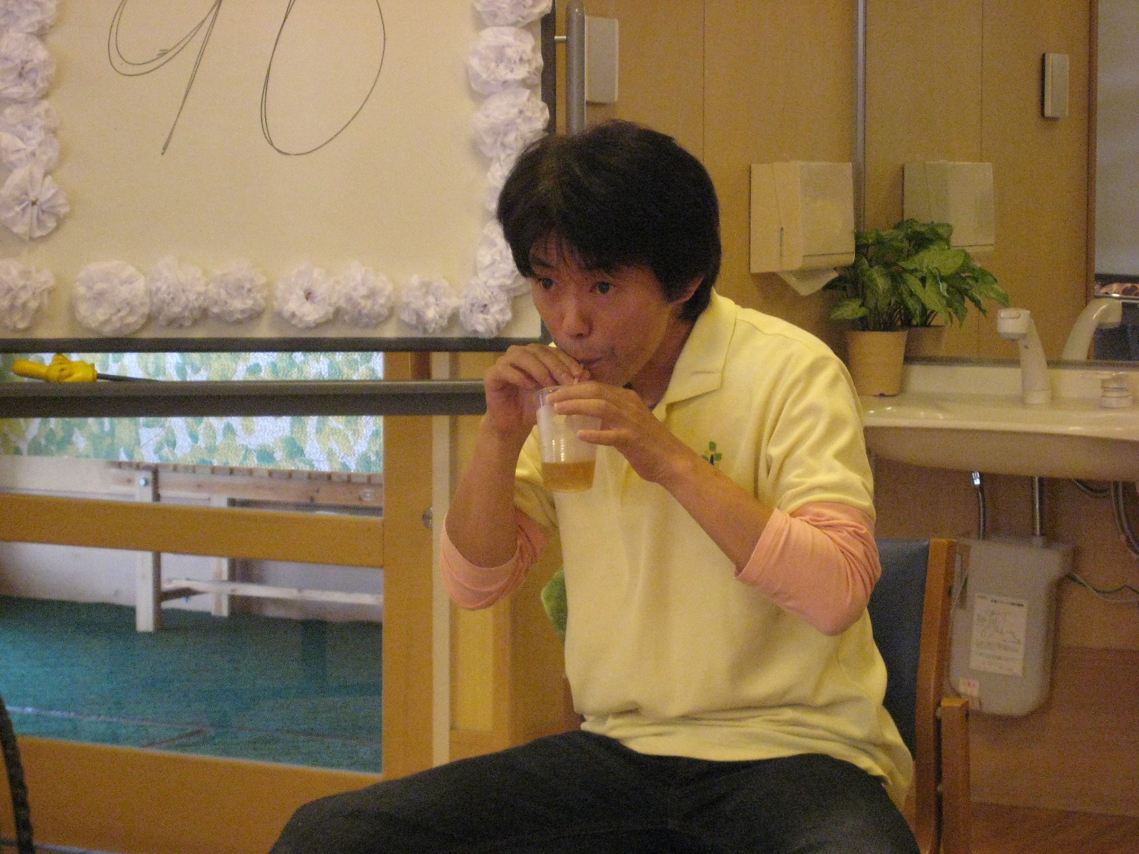 お茶の早飲み競争では、コップに入ったお茶をストローで一気飲み!目を見開いて飲む職員や息をするのを忘れてむせ