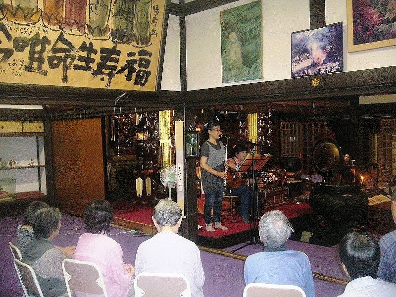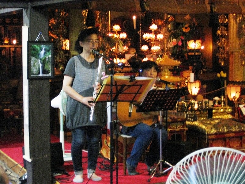 本堂で行なわれた、オレンジマーマレードの 心 に染みいるフルートとギター演奏の音色が境内一杯に