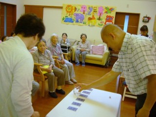 敬老会やりましたよ! 徳地あいおい苑 2011.09.21 日誌 ウチでも”敬老会”やりましたよ。 楽しくすごせたら...と思って マジックショーを行いました。 マジシャンに当てられないようにカードを選ぶのですが、 なぜか、当たってしまうのです ツꀀ さっき、『カチッ』 『シュッ』て何か音がしたよ...と皆さん ”ネタ” バレバレでした。アハハ 前後の記事 最新記事へ 「イルカのショー」を見ることができました。 徳地あいおい苑 古い記事へ ソフトバレーボール大会結果報告【防府事業部】