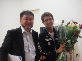 その後、先日開催された山口大会にて見事優勝し、金メダルを2個も獲得され、大会新記録も樹立した出戸端さんの表彰が理事長よりありました。熱い口づけこそは無かったものの、熱い抱擁・・・笑顔のツーショット・・・いただきました(^O^)