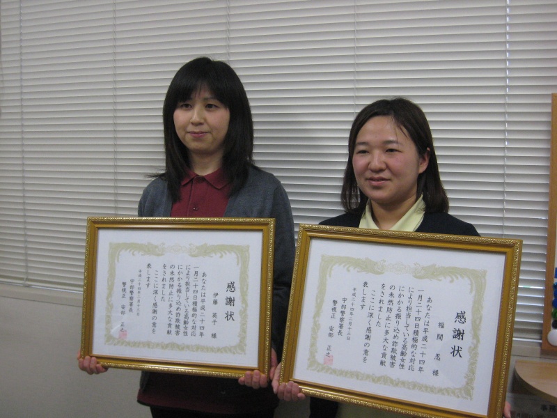 本日、架空請求詐欺を未然に防いだとして、宇部あいおい苑のヘルパーと、居宅のケアマネジャーに宇部警察署から感謝状が贈られました。