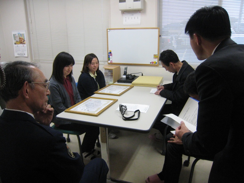 宇部あいおい苑の事務所の中は、記者会見場に早変わり・・・。こんな事は生まれて初めてだし、もう一生ないだろうと思うと緊張して、足も声も震えました。左手前の方は宇部警察署の署長さんです。
