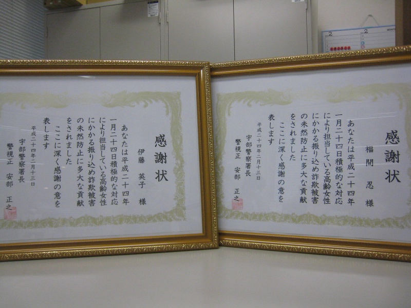 宇部警察署から感謝状をいただきました! (宇部あいおい苑)