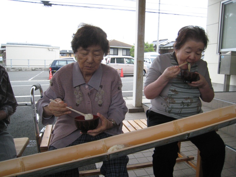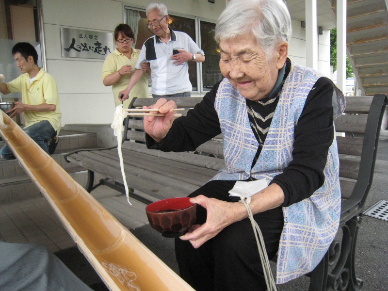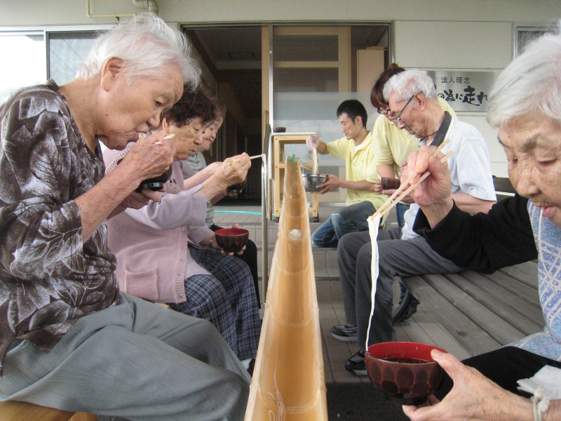しっかり体を動かした後は、みんなで楽しくソーメン流し。日頃の行いが良いせいか、前日までの雨が嘘のように晴れ、絶好のソーメン日和!?