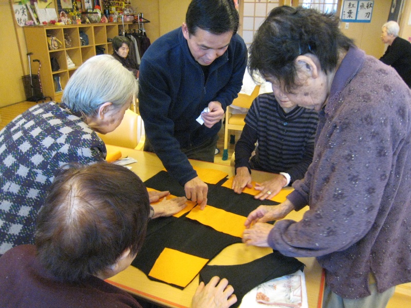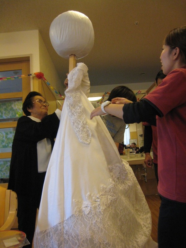 後ろにしっかり“ウベあいおい苑長生きバンザイ”と書いてあります!なかなか後ろ姿もステキでしょ!誰かお嫁さんにして下さい。花婿募集中です!