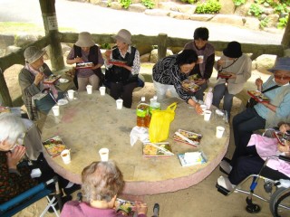 白や紫色に染めたハンショウブを眺め、利用者様はうっとり。