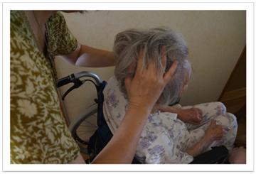 最期に、頭は水のいらないシャンプーで丁寧に洗っていきます。