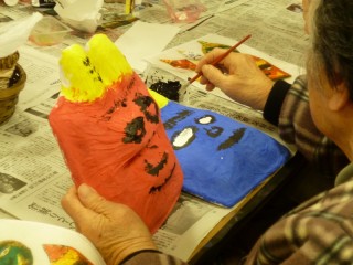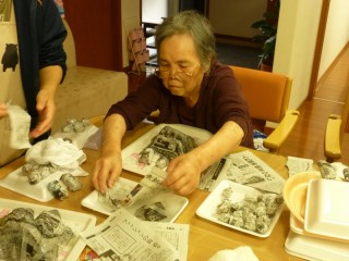 水溶き糊が入ったトレーに新聞紙を浸けては重ね・・・