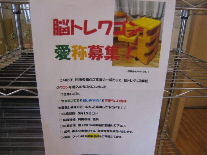 このたび、宇部あいおい苑では、利用者様の声に押されて(?)、脳トレグッズ満載のワゴンを近日中に導入することになりました。