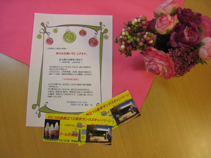宇部あいおい苑では、8月中を「創立10周年サンクス・キャンペーン~これまでも、これからも」と銘打って、これまでご支援していただいた利用者様、ご家族の皆様、関係機関・団体に「ありがとう」を伝えるキャンペーンを展開することといたしました。