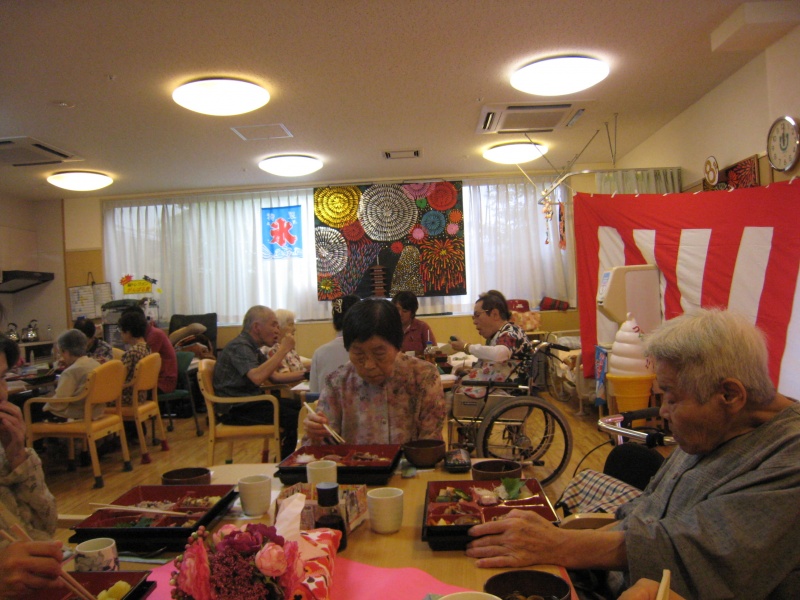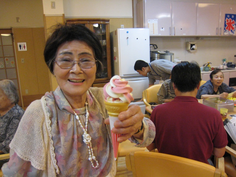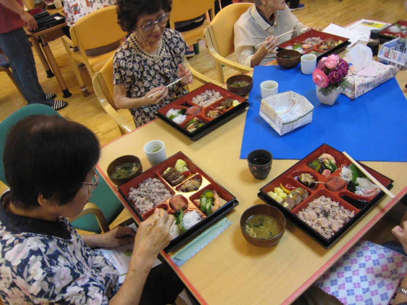 総料理長が腕を振るった豪華弁当に皆さんニコニコ舌鼓。昼食後は、「夏バテ防止キャンデー」のプレゼント。おやつにはなんとソフトクリームの実演試食・・・