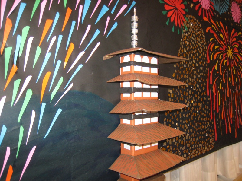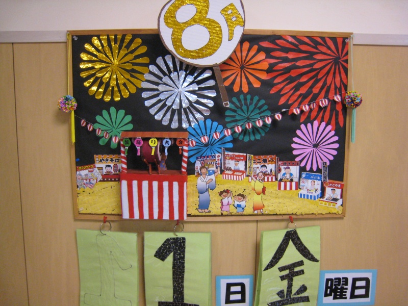 利用者様が花火をイメージして、金、銀、赤、青などカラフルな折り紙で丹精に作り上げました。