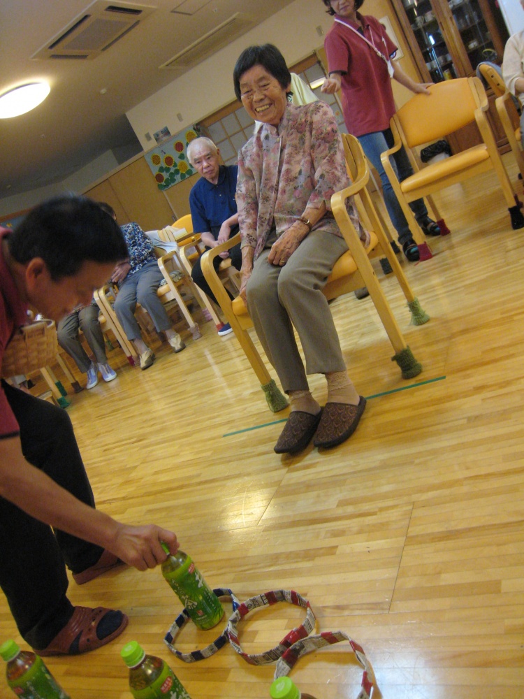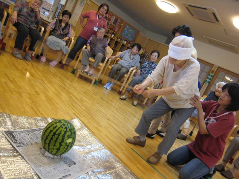 あざやかな大花火の貼り絵のもと、スイカ割や輪投げなど昔懐かしいゲームに興じ、利用者のみなさんと輪になって、「炭坑節」を踊りました。最後には、甘く冷たいかき氷を頂き、笑顔のうちに楽しいひとときを過ごしました。