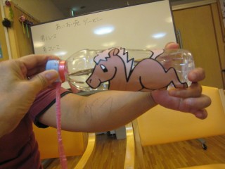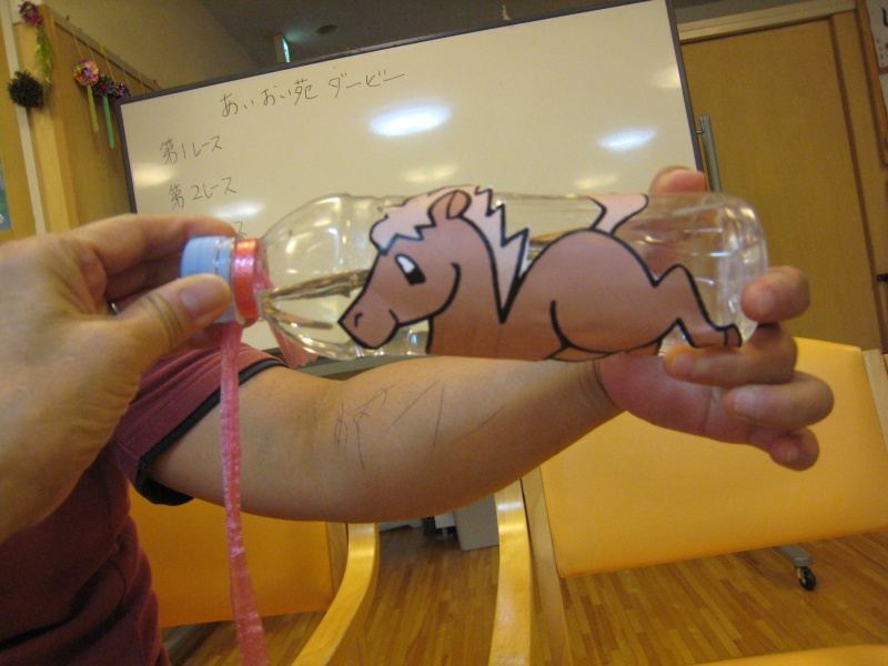 利用者様それぞれに、“○○インパクト”“△△ウララ”“☆☆テイオウ”に名前をつけ、ペットボトルの馬を走らせていただきました。