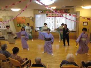 演目は、天津の舞、巌流島・・・フィナーレのきよしのズンドコでは拍手喝さいの満面の笑顔。中には飛び入りの利用者さんも。豪華絢爛、勇壮優雅な踊りを披露していただきました。