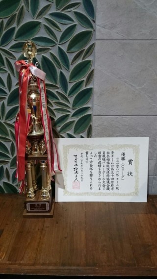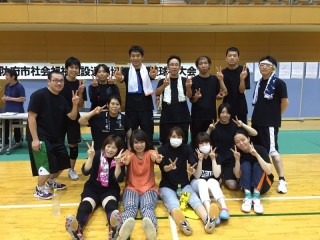 ついに決勝。相手は愛光園さん。ベテラン・若手・女性とバランスのとれたチーム。マイペースで皆が好き勝手に活躍~失敗してきたこのチームが初めてひとつに・・・まさにチームひとつの会!円陣を組み、『ここまで来たら~絶対優勝するぞ~~オー!!』の掛け声。ギリギリ6名しかメンバーがいなかった為、交代するわけにもいかず体力的にキツイ40代私は完全に足に来ていました。最後は、押しに押して2セット連取。優勝~~~。9年ぶり2度目、悲願の優勝を果たしました。