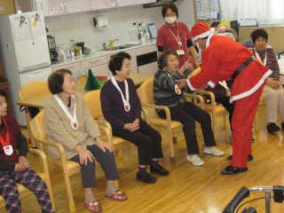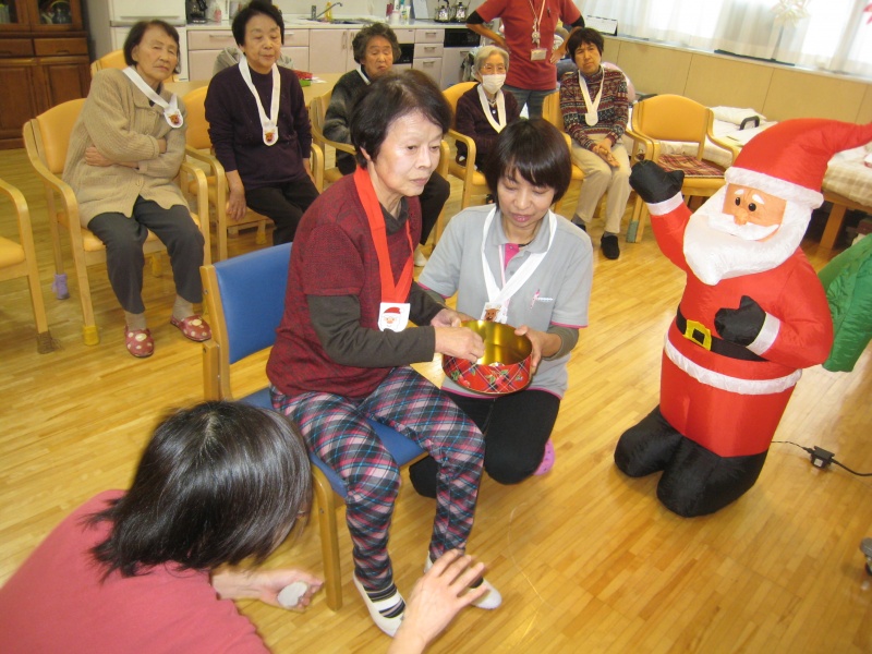 利用者様は、「サンタ」・「トナカイ」チームに分かれ、職員が趣向を凝らした色々なゲームにチャレンジ。イベントの最後には、はるばるサンタさん登場で拍手喝采。