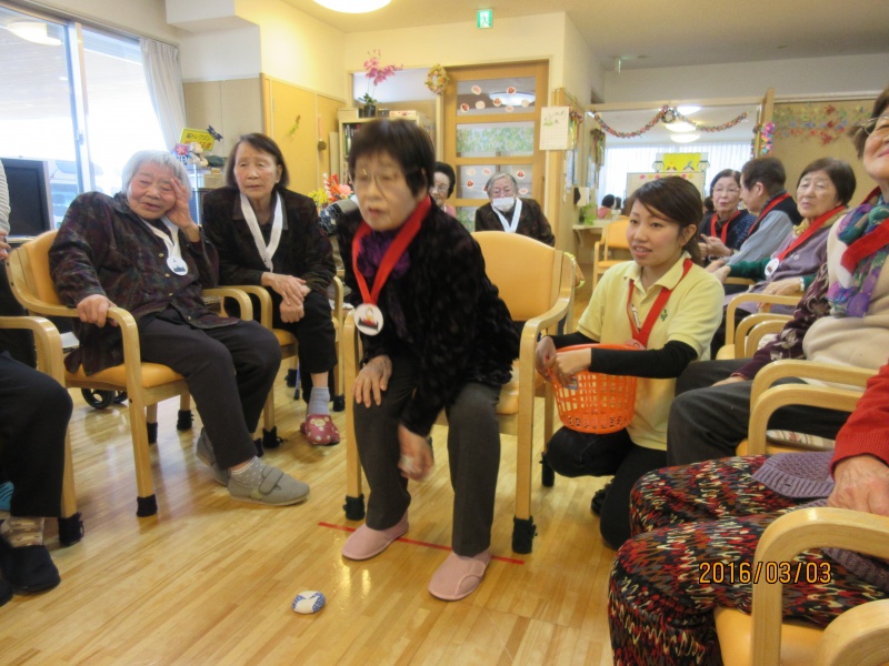 利用者様は、お雛様チーム、お内裏様チームに分かれ、職員が趣向を凝らして考えたゲームに大はしゃぎ。