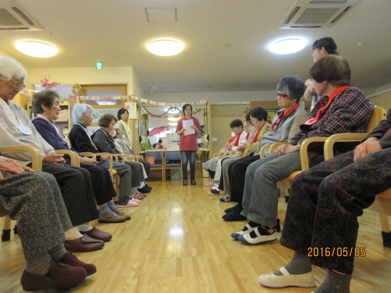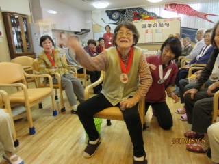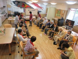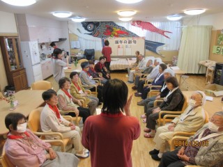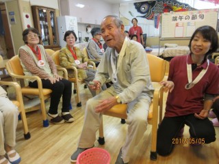 大型連休最終日の5日。宇部あいおい苑では、利用者様、職員が「真鯉チーム」「緋鯉チーム」に分かれての「端午の節句」にちなんだ室内ゲームに大はしゃぎ。