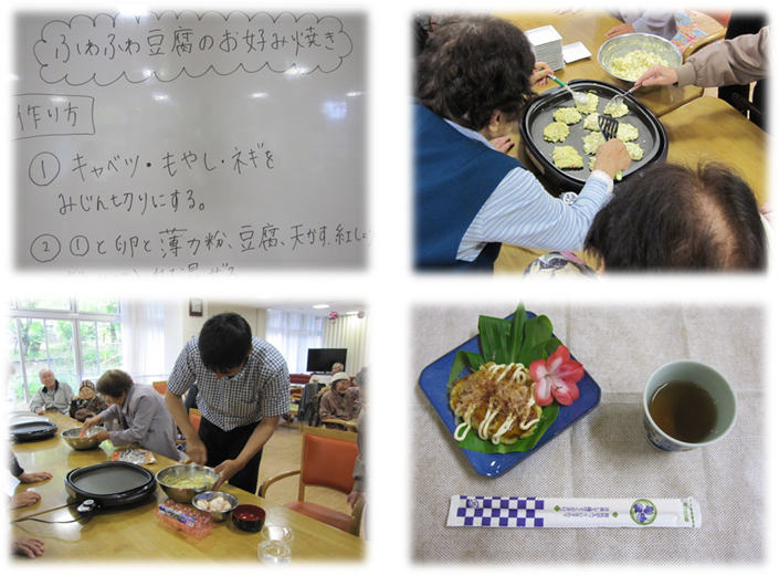 16日のたまのやのレクレーションは、ふわふわ豆腐のお好み焼を作って食べるという
