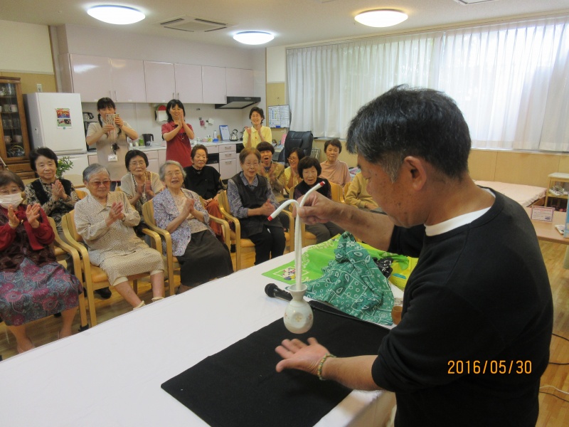 いざ、ショーが始まると、利用者様は不思議な顔で「あれ?」「なぜ?」のオンパレード、時には御茶目な失敗に大爆笑。
