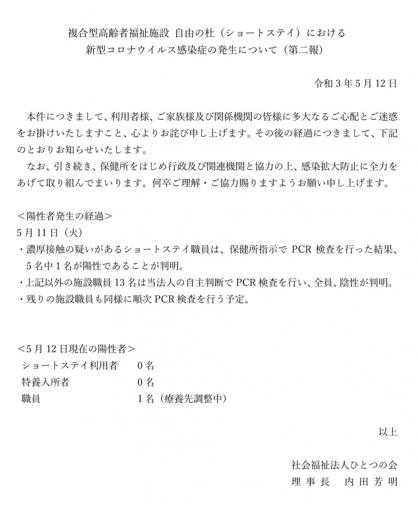 新型コロナウイルス感染症の発生について【第二報】 - 社会福祉法人ひとつの会