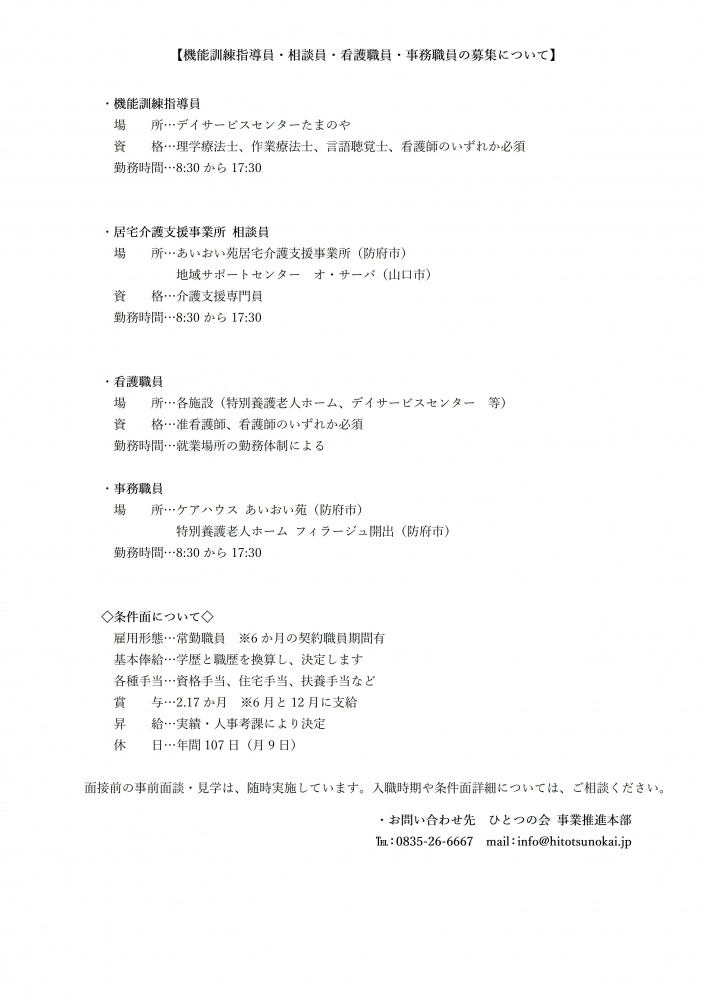 機能訓練指導員・相談員・看護職員・事務職員の募集について