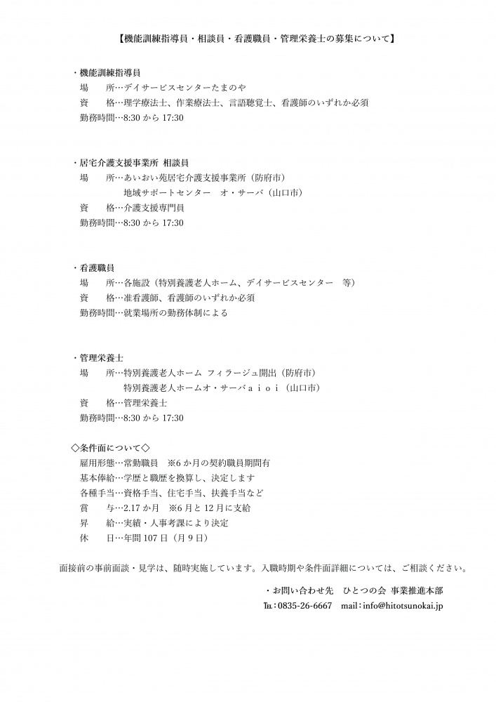 機能訓練指導員・相談員・看護職員・管理栄養士の募集について